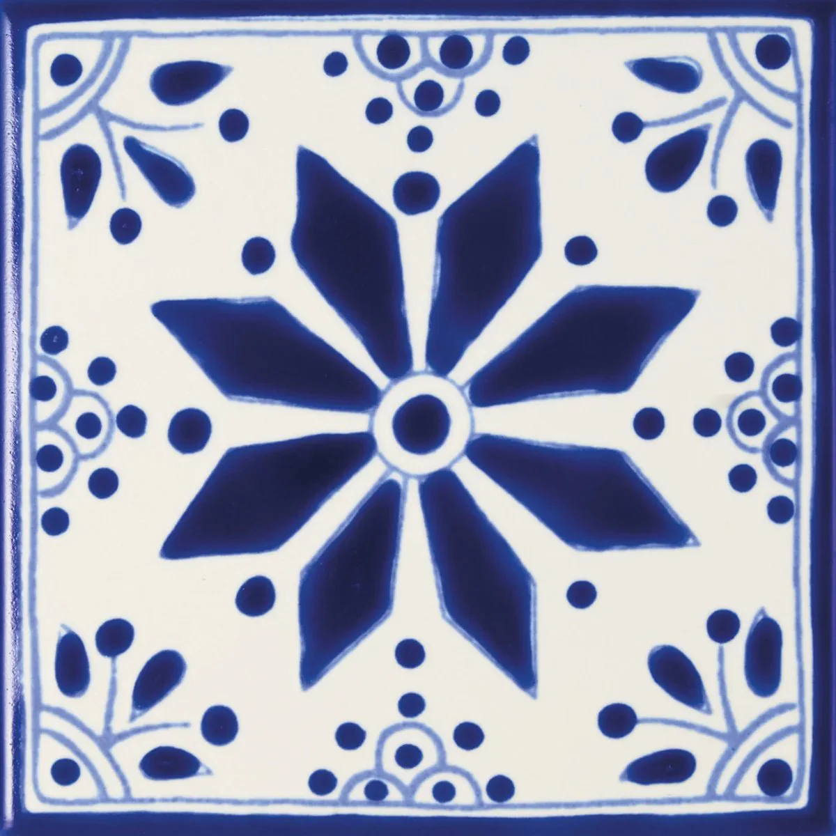A highlight of the Fired Earth Acapulco collection, the Zenil design offers a softer, more ornate aesthetic than its more rigid geometric counterparts. Meticulously hand-decorated on a traditional terracotta base, the "Zenil" pattern features a delicate central blossom framed by intricate border details. The deep, vibrant pigments are sealed under a high-gloss glaze that creates a luminous, light-catching surface. Whether used to create a bespoke "tile rug" effect on a feature wall or mixed into a vibrant patchwork with Alva or Merida, these tiles offer an authentic, artisanal luxury that transforms any space into a global sanctuary.