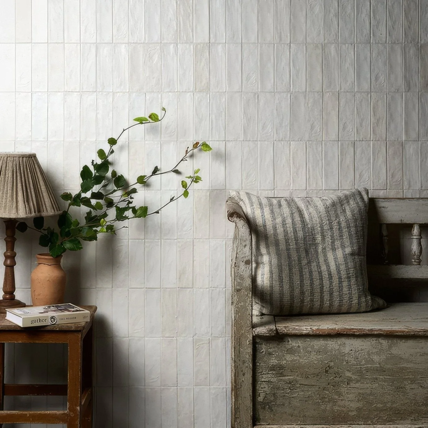 Because the surface isn't perfectly flat, it catches the light in different ways throughout the day. This "dappled" effect prevents the white wall from looking clinical or cold. Browse wall tiles.